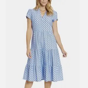 Sky blue midi dress with small all-over geometric print. Short sleeves and subtle V-neck. Fitted waist with flowing tiered skirt. Lightweight and effortlessly feminine.