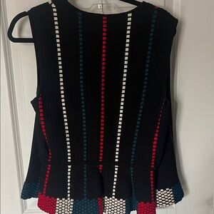 Sleeveless V-neck knit top with matching skirt. Black base featuring vertical dotted stripes in red, teal and white. Coordinating colored hem details. Stretch ribbed knit fabric for comfort.