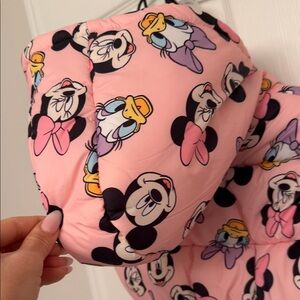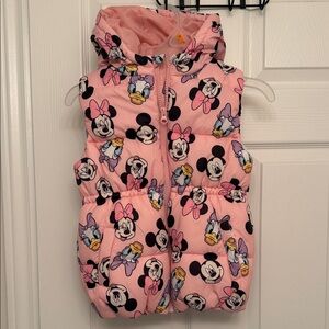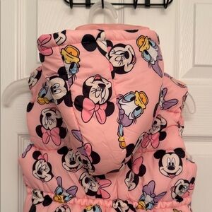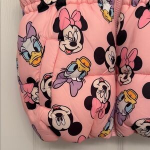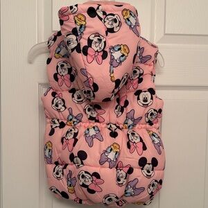 Soft pink hooded puffer vest featuring an all-over Minnie Mouse and friends print. Lightweight insulated design for everyday warmth. Front zip closure and side pockets for easy wear. Cute pink print that pairs well with jeans or leggings.