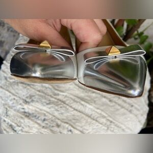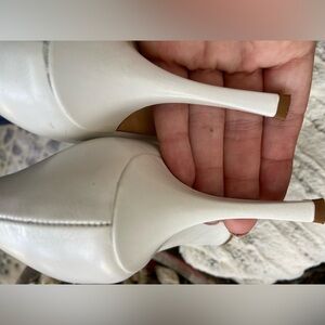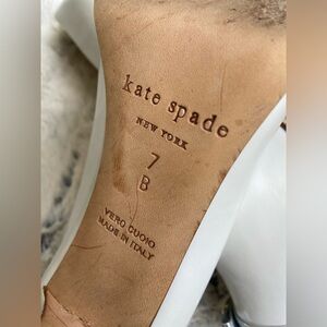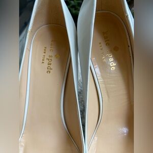 Sleek pointed-toe pumps by kate spade. Cream leather upper with metallic silver cap toe. Small decorative bow and gold-tone stud accent. Classic silhouette for dressy occasions. Size 7. Worn once.