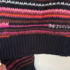 Chic striped sweater with vibrant colors. Features crew neck and long sleeves. Ideal for layering. Damage to stitching, in photo.