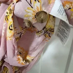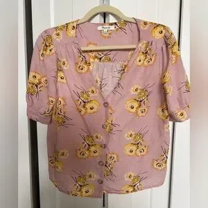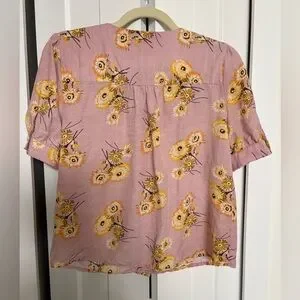 Soft pink button-down blouse with yellow floral clusters. Short sleeves and a gentle V-neck. Lightweight, breathable fabric. Easy to style for casual looks.