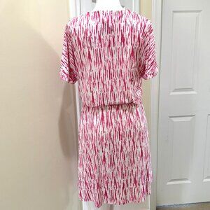 A lightweight, warm‑weather INC short‑sleeve dress with a flattering V‑neckline and a comfortable elastic waistband that creates a naturally gathered, waist‑defining shape. The fabric features a bright white base with bold pink abstract vertical brush‑stroke stripes, giving it a fresh, summery, and eye‑catching look. Midi length and slip-on for easy wear.