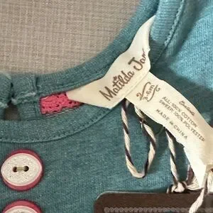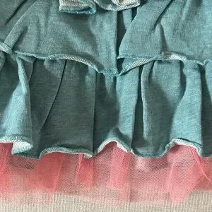 Adorable teal dress with layered ruffles. Pink accents on sleeves and hem. Button detail on front.