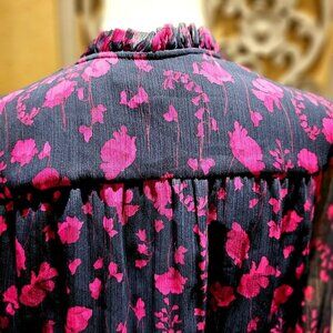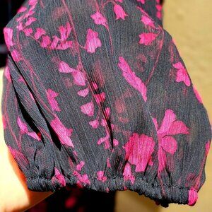 This floral dress features a sophisticated design with long sheer sleeves, ruffle details, and a cinched waist for a polished silhouette. Crafted with a lightweight polyester blend, it combines comfort with elegance, making it suitable for formal and semi-formal settings. The vibrant print adds a stylish touch to its classic navy base.