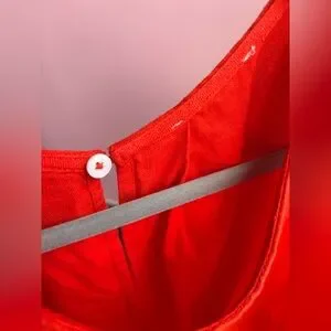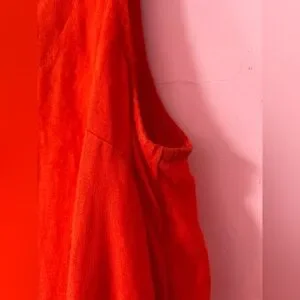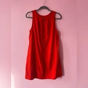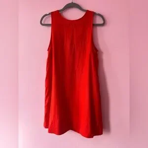 Madewell 100% linen shift dress size L in Flame red. The fabric is not see through. Hidden side pockets. Top/neck is more fitted but body is loose.
