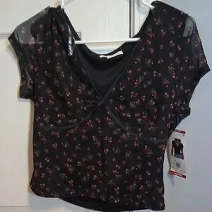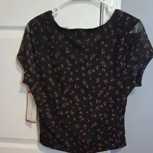 Elegant black crop top with floral design. Features mesh overlay. Ideal for casual outings.