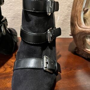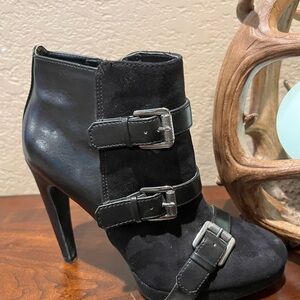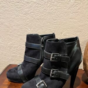 Chic black ankle boots with triple strap detail. Sleek and stylish design. Ideal for any occasion. stiletto Heel is 3 1/2” Straps are adjustable. There is a small discolored spot on toe please see photos