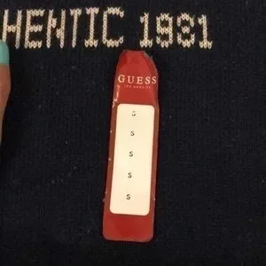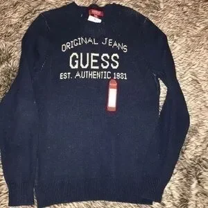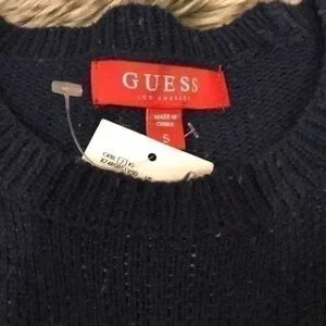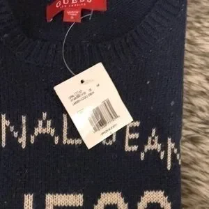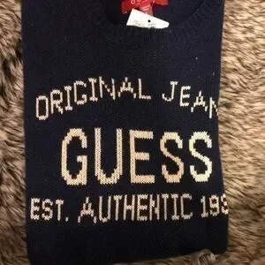 NWT size small guess Jeans sweater. Navy blue. Never worn. Distressed wool sweater. Crew neck. Cream/ tan colored lettering.