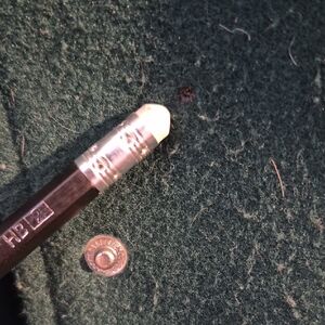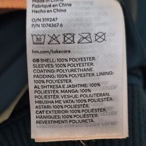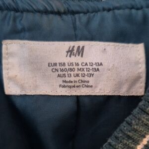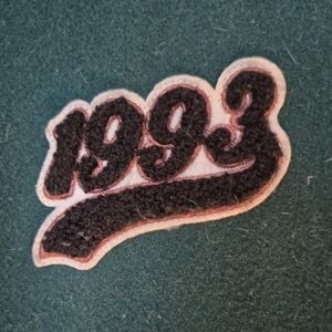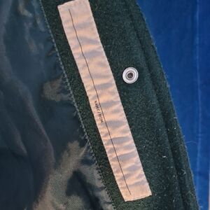 Varsity letterman jacket. Forest green body with cream faux leather sleeves. Large AM chenille patch and stitched number detail. Front snap closures and striped ribbed hem. Small stain on front.