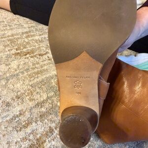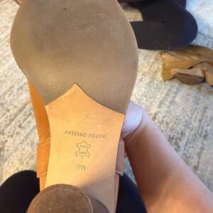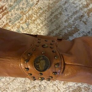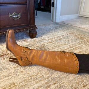Stylish knee-high leather boots by ANTONIO MELANI. Tan leather with studded trim and harness detail. Stacked heel for added height. Sleek pointed toe and side zipper closure. Versatile design for casual or dressy looks.