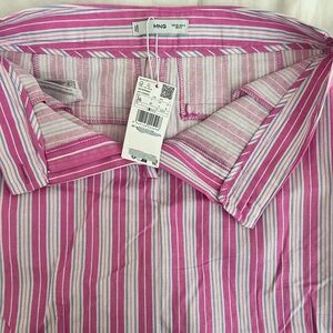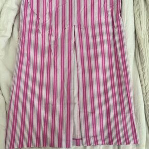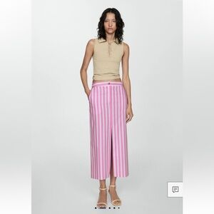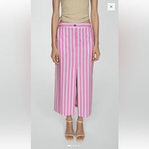 Stylish midi skirt with pink and white stripes. Features a front slit for added flair. Ideal for versatile wear.