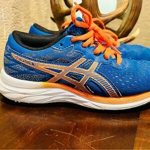 Stylish Asics sneakers with vibrant blue and orange colors. Designed for comfort and active play.