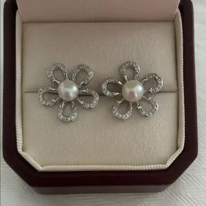 Silver Flower Pearl Earrings | Sterling Silver Posts | Holiday Gift for Her