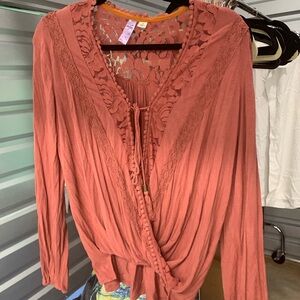 Soft lace-trim V-neck wrap blouse with tie-front closure. Lightweight, draped silhouette. Delicate floral lace at back and neckline. Feminine, everyday wear piece.