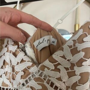 Chic lace dress with cream underlay. Features delicate white floral patterns. Ideal for elegant events.