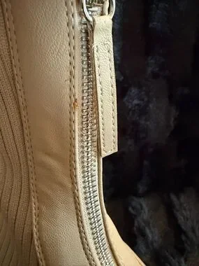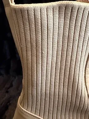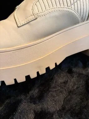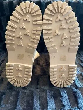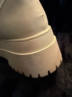 Sleek cream combat boots with chunky soles. Double zippers for easy wear. Stylish and versatile.