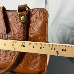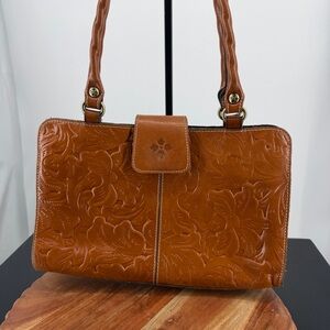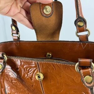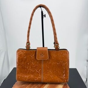 Patricia Nash Rienzo Satchel, a structured leather handbag featuring a tooled floral design and twisted rope handles