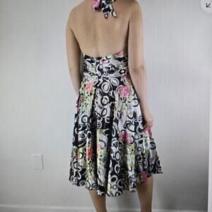 The FAUST Paris Designer Geometric Halter Midi Dress in satin is a stylish and versatile option for a variety of occasions. The sleeveless design with a halter neckline and tie closure adds a touch of elegance, while the black, white, and multi-color geometric pattern adds a modern twist. Made of polyester satin, this A-line dress features a bow accent and is lined for added comfort. Perfect for travel, weddings, parties, or formal events, this dress can be worn year-round with its timeless style and vintage-inspired design. #wedding #cocktailparty #weddingseason #derby