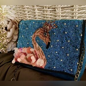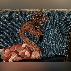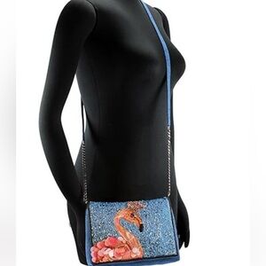 Add a splash of fun to your outfit with the MARY FRANCES Queen Flamingo Embellished Denim Purse. This whimsical crossbody handbag features a charming flamingo design adorned with intricate embellishments, making it a standout accessory for any occasion. Crafted from durable denim, it combines style and practicality with its convenient crossbody strap. Perfect for those who love a touch of playful elegance in their accessories!