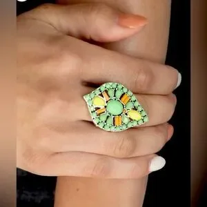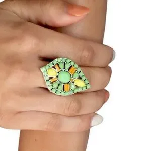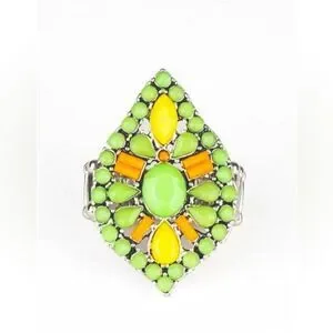 Green Rings featuring oval, round, teardrop, and marquise shapes, a vivacious collection of orange, yellow, and green beads are encrusted along the top of a silver frame, creating a colorful tribal centerpiece. Features a stretchy band for a flexible fit.