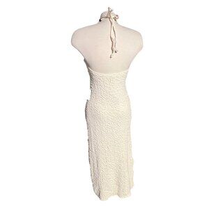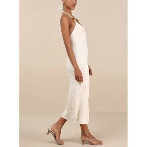 This is a Lulus Meike Cream Textured Knit Beaded Halter Midi Dress.