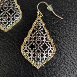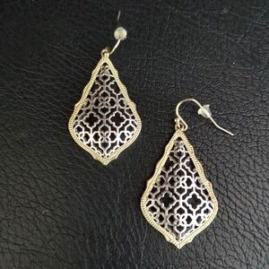 Kendra Scott earrings are silver tone filigree with gold plated frame. Good condition.
