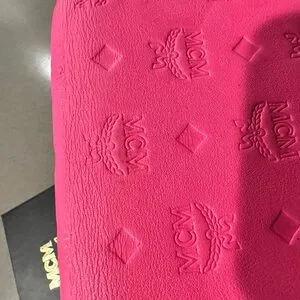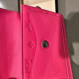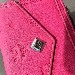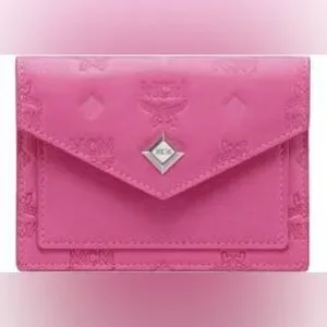 Compact envelope-style clutch in vibrant hot pink. Embossed MCM logo pattern across the exterior. Silver-tone diamond logo plate on flap for a polished touch. Streamlined design suitable for day or night.