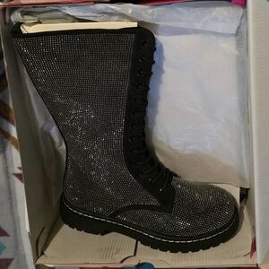 Sparkling black lace-up combat boots by torrid. Full rhinestone-covered upper for bold shine. Sturdy chunky sole for confidence and support. Edgy, glam look for day or night.