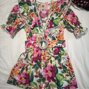 Vibrant floral romper. Features pink and green patterns. Short sleeves with ruffle details. Belted waist for a flattering fit.