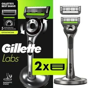 GilletteLabs with Exfoliating Bar, Gillette's first razor with exfoliating technology built into the handle, helps remove dirt and debris before the blades pass for a close, smooth shave. The 2D FlexDisc's circular pivot technology maximizes the blade's contact with skin in every stroke, adapting to the contours of your face. This innovative design combined with the iconic 5-blade cartridges featuring 5 of Gillette's thinnest and finest blades* mounted on highly responsive springs. Once you're done grooming, simply dock your razor in a premium magnetic stand that keeps it clean, dry and ready to use.