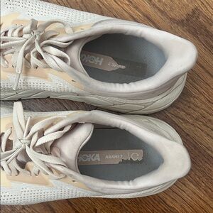 Cream Hoka athletic shoes with light blue accent on the toe. Cushioned midsole for smooth rides. Breathable perforated upper and secure lace closure. Designed for lightweight, everyday running.