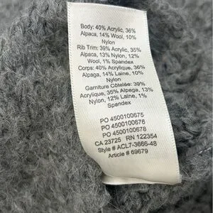 • Fabric Content: 40% Acrylic 36% Alpaca 14% Wool 10% Nylon