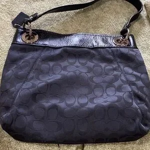 Classic Coach shoulder bag in black signature jacquard. Leather trim and handle with polished hardware. Subtle logo plaque on front. Spacious interior silhouette for daily use.