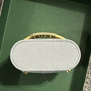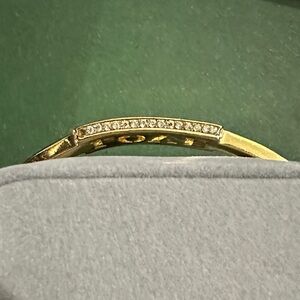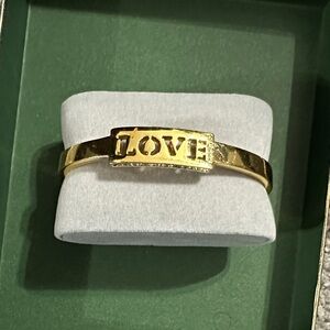 Elegant gold-tone bangle featuring a cutout 'LOVE' plaque. Designed for everyday wear and special occasions. Lightweight and comfortable with a polished finish. The gold color adds a timeless touch to any outfit.