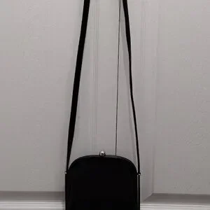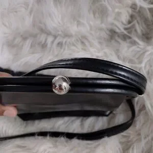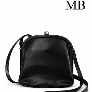 Classic MB black structured crossbody bag featuring a timeless kiss lock clasp closure and minimalist vintage-inspired silhouette. Compact yet stylish, perfect for everyday wear, evening outings, travel, or minimalist fashion looks.