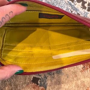 Stylish burgundy/red clutch featuring a striking dragon design. Includes a convenient wristlet strap. Ideal for a bold fashion statement. This wristlet has inside compartments for credit cards and a zippered pocket for cash. In new condition and no tags