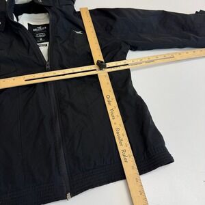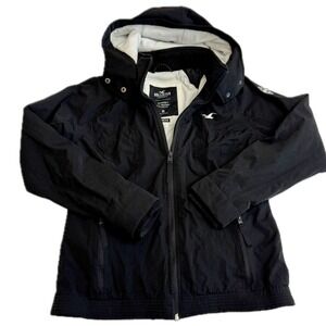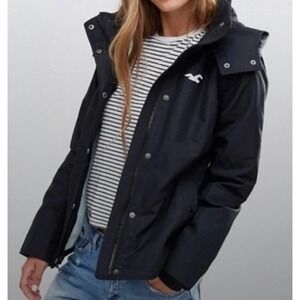 Keywords: Hollister, jacket, women, black, hooded, fleece lined, all weather, gorpcore, outdoor, winter, fall, stretch, zip up, casual, warm, activewear, windbreaker, rain jacket, gull logo, athletic