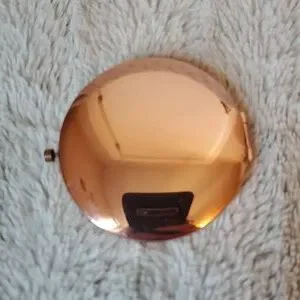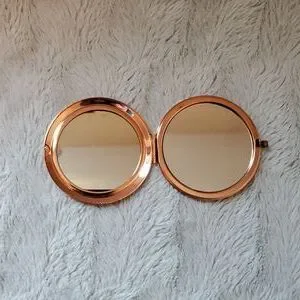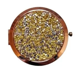 Round compact mirror rose gold tone with gold and silver tone rhinestone accents. Perfect for adding sparkle to your essentials.