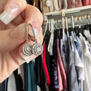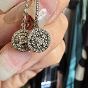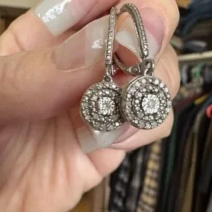 Beautiful Macy’s Bridge Diamond earrings featuring 1/10 carat total weight diamonds set in sterling silver. These elegant drop earrings have a vintage-inspired halo design with a center diamond surrounded by smaller accent diamonds for added sparkle.
