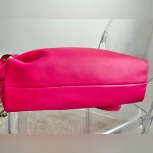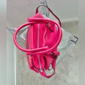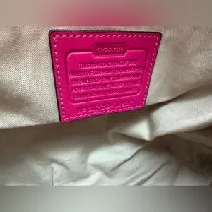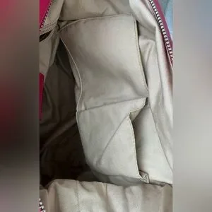 Beige fabric interior, 2 open pockets, one zip close pocket. Zip closure pocket on back exterior. Silver hardware.