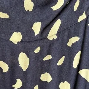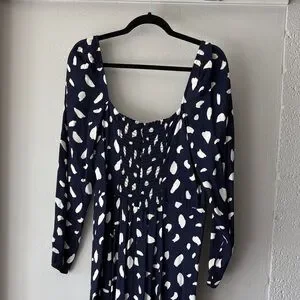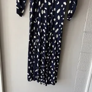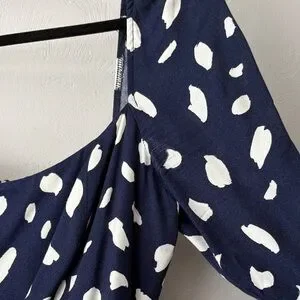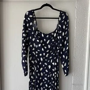 Chic navy blue dress with an all-over white abstract polka dot print. Features a square neckline, long sleeves, and a front slit for easy movement. Flattering A-line silhouette that transitions effortlessly from day to night. Comfortable, stylish, and versatile for many occasions.