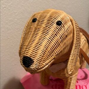 Adorable dog-shaped wicker bag by . Features a natural wicker design with a charming pink accent. Ideal for adding a playful touch to your style.