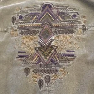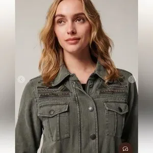 A versatile olive utility jacket with detailed back and sleeve embroidery. Drawstring waist creates a flattering silhouette. Soft, sturdy fabric for comfortable everyday wear. Olive color adds a neutral, stylish touch to any outfit.