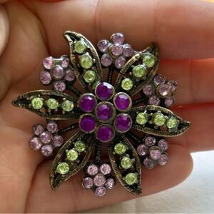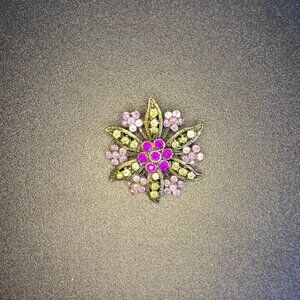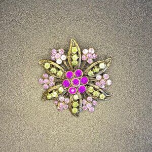 Vintage Rhinestone Flower Brooch Pink Green Tone 2"