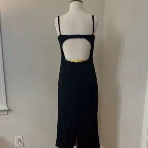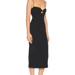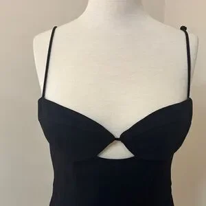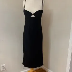 Black Sleek black midi dress with thin spaghetti straps. Subtle front cutout detail at the bust. Smooth, fitted silhouette. Perfect for evening or special events.