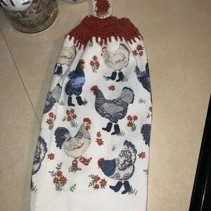 Charming kitchen towel with chicken design. Features rust crochet top for easy hanging. Adds a cozy touch to your kitchen decor.