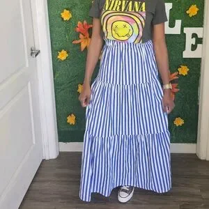 Stylish blue and white striped skirt perfect for any occasion. Add a touch of elegance to your wardrobe with this versatile piece. This is such a cute piece. I’ve only worn a couple times. Adding pics so you can see the versatility!