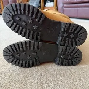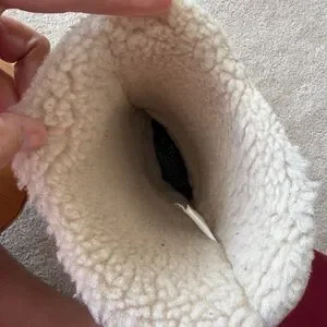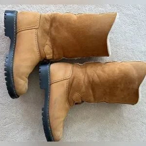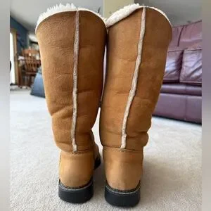 Tall suede winter boots with soft shearling trim. Toggle strap detail at the ankle. Cushioned interior for warmth. Rugged sole for traction in cold weather. Neutral tan pairs with many outfits. Sz 8