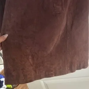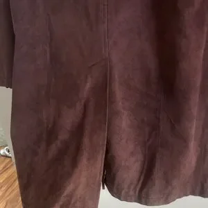 Luxurious suede trench coat. brown hue with slight discoloration on the bottom. Timeless design with button closure.